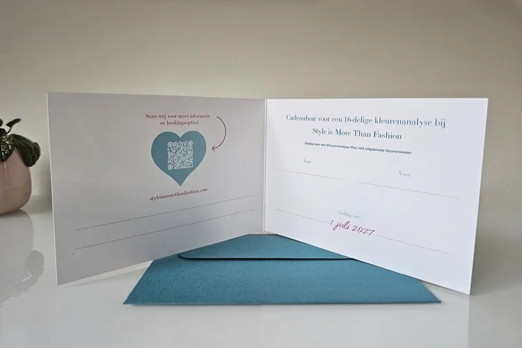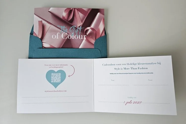 Met deze bon geef je de 16-delige kleurenanalyse cadeau inclusief handig kleurencreditcardje. De bon bevat een QR-code naar alle informatie en de boekingsopties.